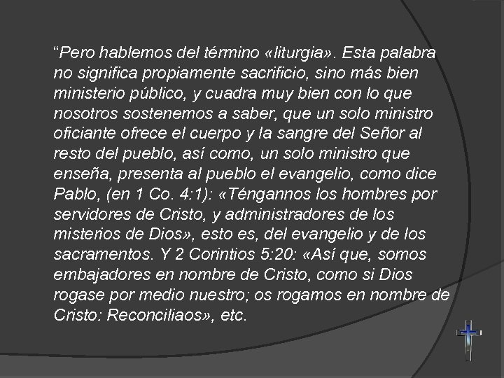 “Pero hablemos del término «liturgia» . Esta palabra no significa propiamente sacrificio, sino más bien ministerio público, y cuadra muy bien con lo que nosotros sostenemos a saber, que un solo ministro oficiante ofrece el cuerpo y la sangre del Señor al resto del pueblo, así como, un solo ministro que enseña, presenta al pueblo el evangelio, como dice Pablo, (en 1 Co. 4: 1): «Téngannos los hombres por servidores de Cristo, y administradores de los misterios de Dios» , esto es, del evangelio y de los sacramentos. Y 2 Corintios 5: 20: «Así que, somos embajadores en nombre de Cristo, como si Dios rogase por medio nuestro; os rogamos en nombre de Cristo: Reconciliaos» , etc.