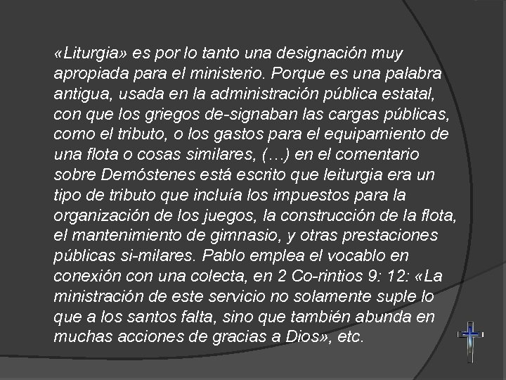 «Liturgia» es por lo tanto una designación muy apropiada para el ministerio. Porque es una palabra antigua, usada en la administración pública estatal, con que los griegos de signaban las cargas públicas, como el tributo, o los gastos para el equipamiento de una flota o cosas similares, (…) en el comentario sobre Demóstenes está escrito que leiturgia era un tipo de tributo que incluía los impuestos para la organización de los juegos, la construcción de la flota, el mantenimiento de gimnasio, y otras prestaciones públicas si milares. Pablo emplea el vocablo en conexión con una colecta, en 2 Co rintios 9: 12: «La ministración de este servicio no solamente suple lo que a los santos falta, sino que también abunda en muchas acciones de gracias a Dios» , etc.