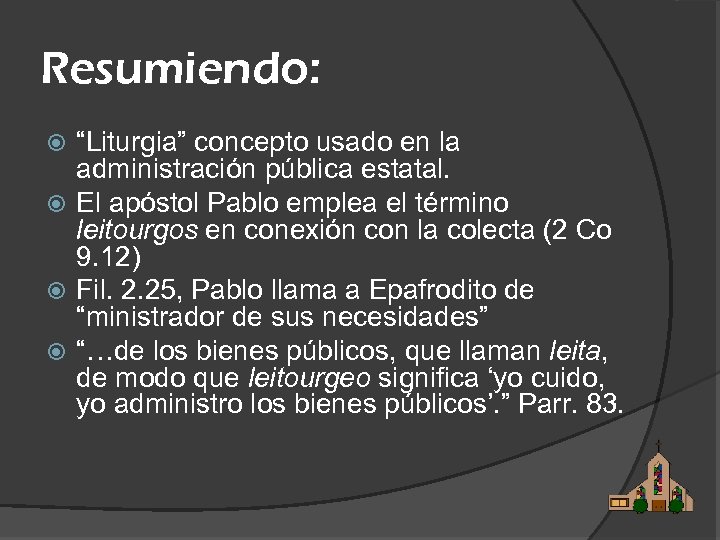 Resumiendo: “Liturgia” concepto usado en la administración pública estatal. El apóstol Pablo emplea el término leitourgos en conexión con la colecta (2 Co 9. 12) Fil. 2. 25, Pablo llama a Epafrodito de “ministrador de sus necesidades” “…de los bienes públicos, que llaman leita, de modo que leitourgeo significa ‘yo cuido, yo administro los bienes públicos’. ” Parr. 83.