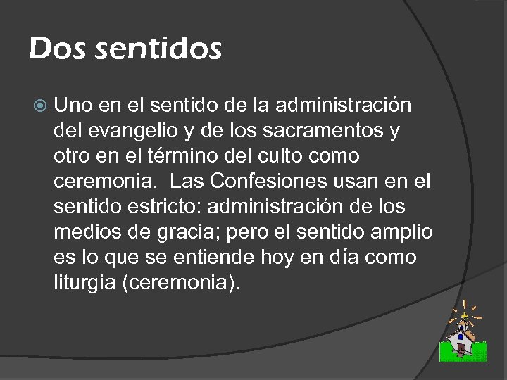 Dos sentidos Uno en el sentido de la administración del evangelio y de los sacramentos y otro en el término del culto como ceremonia. Las Confesiones usan en el sentido estricto: administración de los medios de gracia; pero el sentido amplio es lo que se entiende hoy en día como liturgia (ceremonia).