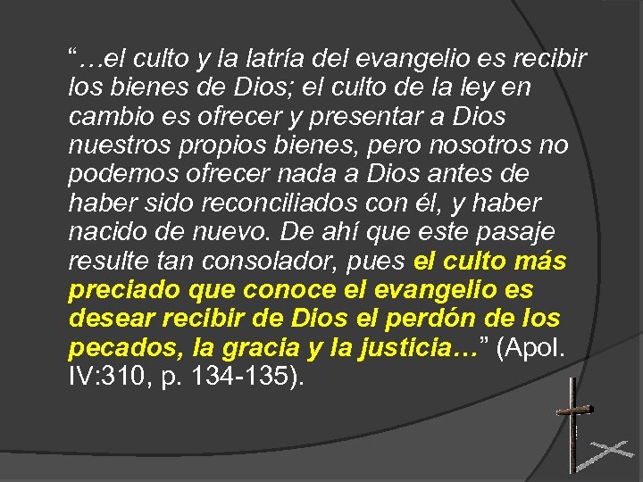 “…el culto y la latría del evangelio es recibir los bienes de Dios; el culto de la ley en cambio es ofrecer y presentar a Dios nuestros propios bienes, pero nosotros no podemos ofrecer nada a Dios antes de haber sido reconciliados con él, y haber nacido de nuevo. De ahí que este pasaje resulte tan consolador, pues el culto más preciado que conoce el evangelio es desear recibir de Dios el perdón de los pecados, la gracia y la justicia…” (Apol. IV: 310, p. 134 -135).