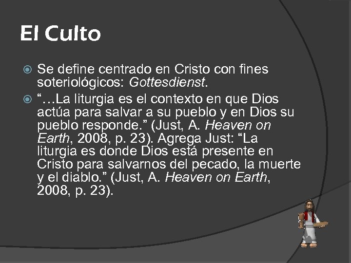El Culto Se define centrado en Cristo con fines soteriológicos: Gottesdienst. “…La liturgia es el contexto en que Dios actúa para salvar a su pueblo y en Dios su pueblo responde. ” (Just, A. Heaven on Earth, 2008, p. 23). Agrega Just: “La liturgia es donde Dios está presente en Cristo para salvarnos del pecado, la muerte y el diablo. ” (Just, A. Heaven on Earth, 2008, p. 23).