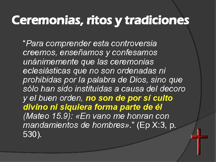 Ceremonias, ritos y tradiciones “Para comprender esta controversia creemos, enseñamos y confesamos unánimemente que las ceremonias eclesiásticas que no son ordenadas ni prohibidas por la palabra de Dios, sino que sólo han sido instituidas a causa del decoro y el buen orden, no son de por sí culto divino ni siquiera forma parte de él (Mateo 15. 9): «En vano me honran con mandamientos de hombres» . ” (Ep X: 3, p. 530).
