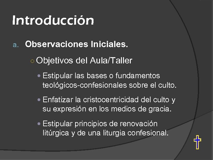 Introducción a. Observaciones Iniciales. ○ Objetivos del Aula/Taller Estipular las bases o fundamentos teológicos-confesionales sobre el culto. Enfatizar la cristocentricidad del culto y su expresión en los medios de gracia. Estipular principios de renovación litúrgica y de una liturgia confesional.