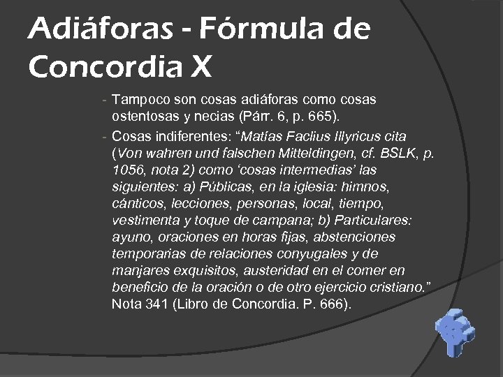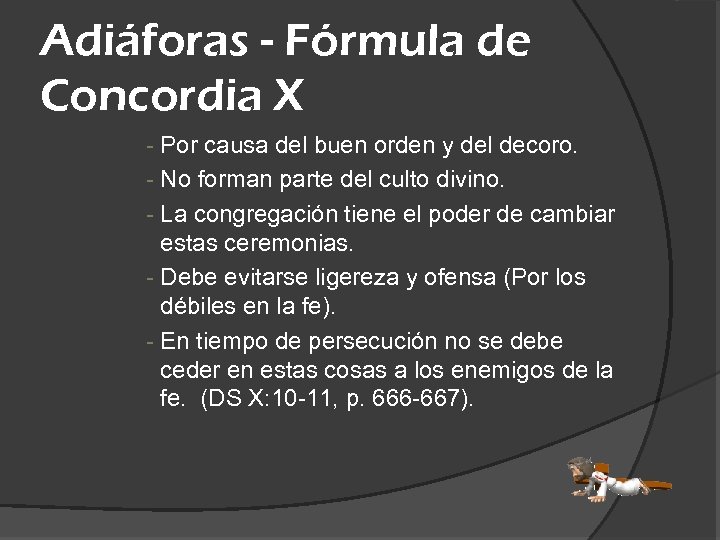 Adiáforas - Fórmula de Concordia X - Por causa del buen orden y del decoro. - No forman parte del culto divino. - La congregación tiene el poder de cambiar estas ceremonias. - Debe evitarse ligereza y ofensa (Por los débiles en la fe). - En tiempo de persecución no se debe ceder en estas cosas a los enemigos de la fe. (DS X: 10 -11, p. 666 -667).