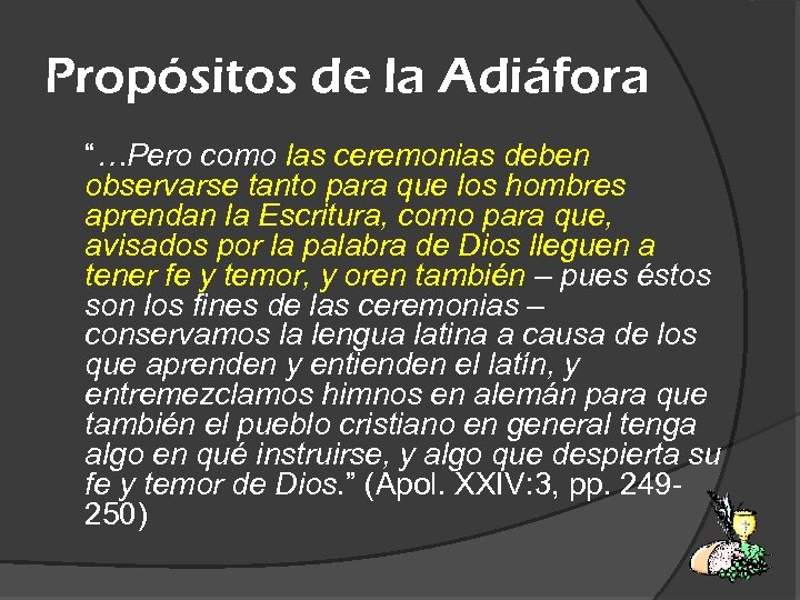Propósitos de la Adiáfora “…Pero como las ceremonias deben observarse tanto para que los hombres aprendan la Escritura, como para que, avisados por la palabra de Dios lleguen a tener fe y temor, y oren también – pues éstos son los fines de las ceremonias – conservamos la lengua latina a causa de los que aprenden y entienden el latín, y entremezclamos himnos en alemán para que también el pueblo cristiano en general tenga algo en qué instruirse, y algo que despierta su fe y temor de Dios. ” (Apol. XXIV: 3, pp. 249250)