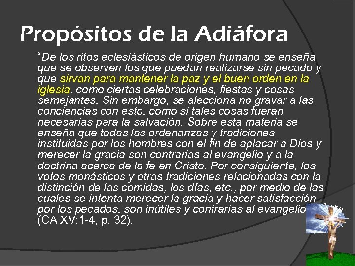Propósitos de la Adiáfora “De los ritos eclesiásticos de origen humano se enseña que se observen los que puedan realizarse sin pecado y que sirvan para mantener la paz y el buen orden en la iglesia, como ciertas celebraciones, fiestas y cosas semejantes. Sin embargo, se alecciona no gravar a las conciencias con esto, como si tales cosas fueran necesarias para la salvación. Sobre esta materia se enseña que todas las ordenanzas y tradiciones instituidas por los hombres con el fin de aplacar a Dios y merecer la gracia son contrarias al evangelio y a la doctrina acerca de la fe en Cristo. Por consiguiente, los votos monásticos y otras tradiciones relacionadas con la distinción de las comidas, los días, etc. , por medio de las cuales se intenta merecer la gracia y hacer satisfacción por los pecados, son inútiles y contrarias al evangelio. ” (CA XV: 1 -4, p. 32).