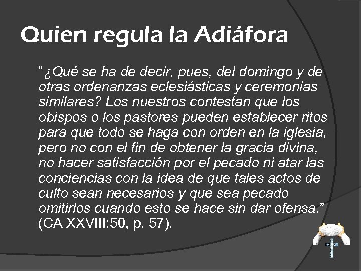 Quien regula la Adiáfora “¿Qué se ha de decir, pues, del domingo y de otras ordenanzas eclesiásticas y ceremonias similares? Los nuestros contestan que los obispos o los pastores pueden establecer ritos para que todo se haga con orden en la iglesia, pero no con el fin de obtener la gracia divina, no hacer satisfacción por el pecado ni atar las conciencias con la idea de que tales actos de culto sean necesarios y que sea pecado omitirlos cuando esto se hace sin dar ofensa. ” (CA XXVIII: 50, p. 57).