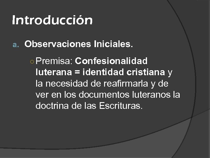 Introducción a. Observaciones Iniciales. ○ Premisa: Confesionalidad luterana = identidad cristiana y la necesidad de reafirmarla y de ver en los documentos luteranos la doctrina de las Escrituras.