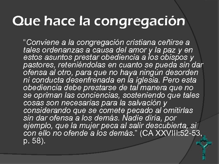 Que hace la congregación “Conviene a la congregación cristiana ceñirse a tales ordenanzas a causa del amor y la paz y en estos asuntos prestar obediencia a los obispos y pastores, reteniéndolas en cuanto se pueda sin dar ofensa al otro, para que no haya ningún desorden ni conducta desenfrenada en la iglesia. Pero esta obediencia debe prestarse de tal manera que no se opriman las conciencias, sosteniendo que tales cosas son necesarias para la salvación y considerando que se comete pecado al omitirlas sin dar ofensa a los demás. Nadie diría, por ejemplo, que la mujer peca al salir descubierta, si con ello no ofende a los demás. ” (CA XXVIII: 52 -53, p. 58).