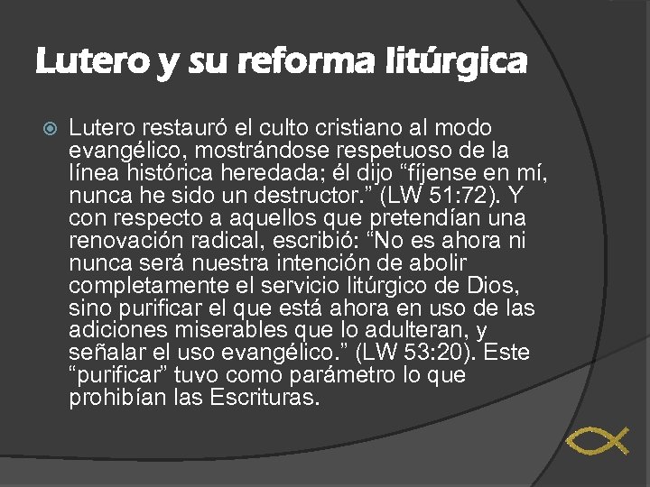 Lutero y su reforma litúrgica Lutero restauró el culto cristiano al modo evangélico, mostrándose respetuoso de la línea histórica heredada; él dijo “fíjense en mí, nunca he sido un destructor. ” (LW 51: 72). Y con respecto a aquellos que pretendían una renovación radical, escribió: “No es ahora ni nunca será nuestra intención de abolir completamente el servicio litúrgico de Dios, sino purificar el que está ahora en uso de las adiciones miserables que lo adulteran, y señalar el uso evangélico. ” (LW 53: 20). Este “purificar” tuvo como parámetro lo que prohibían las Escrituras.
