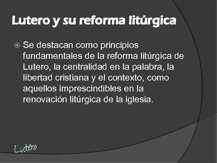 Lutero y su reforma litúrgica Se destacan como principios fundamentales de la reforma litúrgica de Lutero, la centralidad en la palabra, la libertad cristiana y el contexto, como aquellos imprescindibles en la renovación litúrgica de la iglesia.