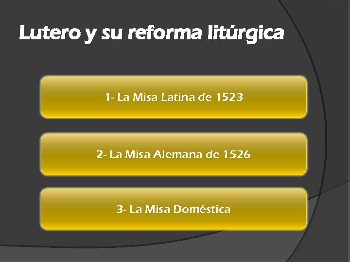 Lutero y su reforma litúrgica 1 - La Misa Latina de 1523 2 - La Misa Alemana de 1526 3 - La Misa Doméstica