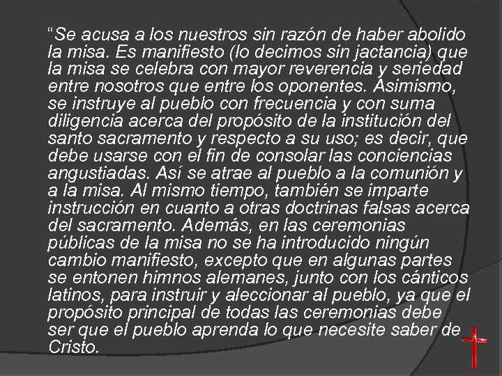 “Se acusa a los nuestros sin razón de haber abolido la misa. Es manifiesto (lo decimos sin jactancia) que la misa se celebra con mayor reverencia y seriedad entre nosotros que entre los oponentes. Asimismo, se instruye al pueblo con frecuencia y con suma diligencia acerca del propósito de la institución del santo sacramento y respecto a su uso; es decir, que debe usarse con el fin de consolar las conciencias angustiadas. Así se atrae al pueblo a la comunión y a la misa. Al mismo tiempo, también se imparte instrucción en cuanto a otras doctrinas falsas acerca del sacramento. Además, en las ceremonias públicas de la misa no se ha introducido ningún cambio manifiesto, excepto que en algunas partes se entonen himnos alemanes, junto con los cánticos latinos, para instruir y aleccionar al pueblo, ya que el propósito principal de todas las ceremonias debe ser que el pueblo aprenda lo que necesite saber de Cristo.