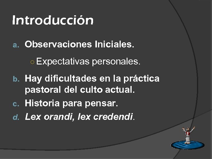 Introducción a. Observaciones Iniciales. ○ Expectativas personales. Hay dificultades en la práctica pastoral del culto actual. c. Historia para pensar. d. Lex orandi, lex credendi. b.