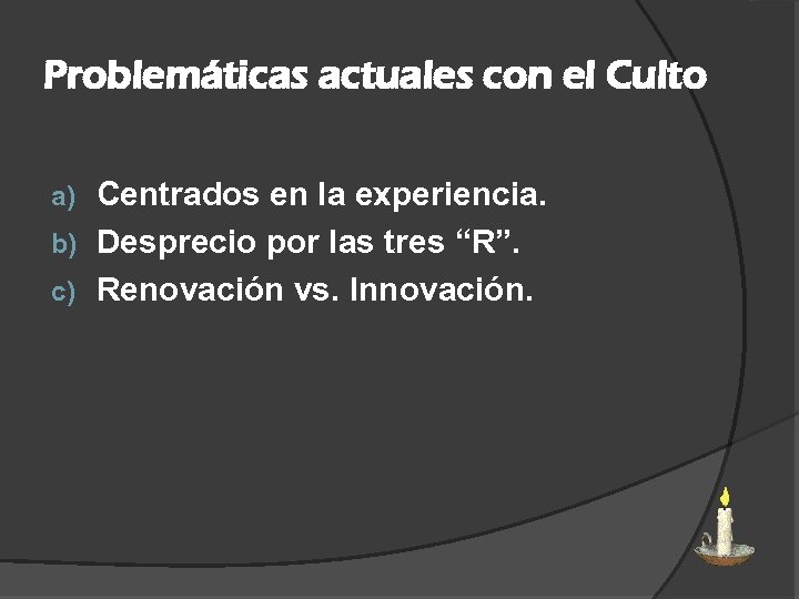 Problemáticas actuales con el Culto Centrados en la experiencia. b) Desprecio por las tres “R”. c) Renovación vs. Innovación. a)
