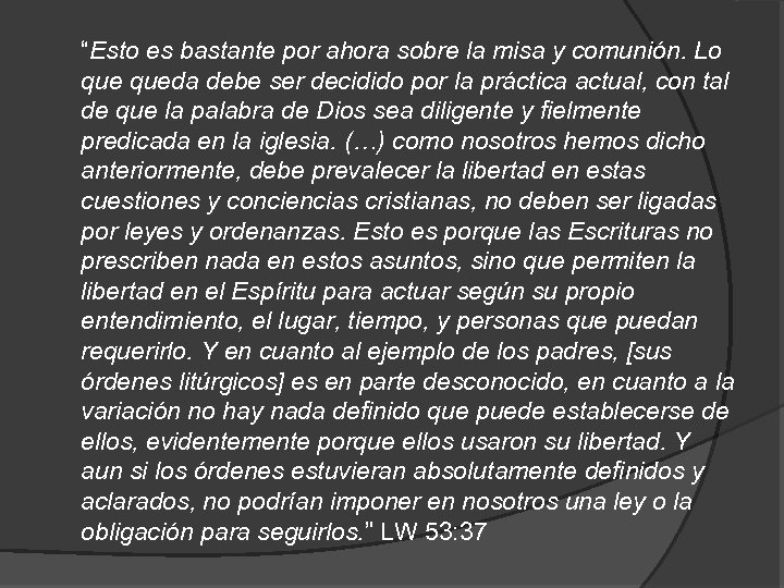 “Esto es bastante por ahora sobre la misa y comunión. Lo queda debe ser decidido por la práctica actual, con tal de que la palabra de Dios sea diligente y fielmente predicada en la iglesia. (…) como nosotros hemos dicho anteriormente, debe prevalecer la libertad en estas cuestiones y conciencias cristianas, no deben ser ligadas por leyes y ordenanzas. Esto es porque las Escrituras no prescriben nada en estos asuntos, sino que permiten la libertad en el Espíritu para actuar según su propio entendimiento, el lugar, tiempo, y personas que puedan requerirlo. Y en cuanto al ejemplo de los padres, [sus órdenes litúrgicos] es en parte desconocido, en cuanto a la variación no hay nada definido que puede establecerse de ellos, evidentemente porque ellos usaron su libertad. Y aun si los órdenes estuvieran absolutamente definidos y aclarados, no podrían imponer en nosotros una ley o la obligación para seguirlos. ” LW 53: 37