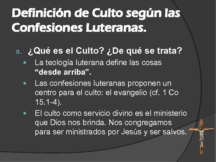 Definición de Culto según las Confesiones Luteranas. ¿Qué es el Culto? ¿De qué se trata? a. La teología luterana define las cosas “desde arriba”. Las confesiones luteranas proponen un centro para el culto: el evangelio (cf. 1 Co 15. 1 -4). El culto como servicio divino es el ministerio que Dios nos brinda. Nos congregamos para ser ministrados por Jesús y ser salvos.