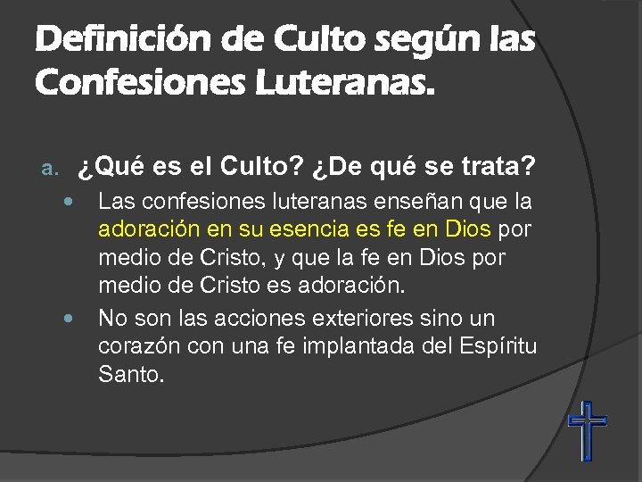 Definición de Culto según las Confesiones Luteranas. ¿Qué es el Culto? ¿De qué se trata? a. Las confesiones luteranas enseñan que la adoración en su esencia es fe en Dios por medio de Cristo, y que la fe en Dios por medio de Cristo es adoración. No son las acciones exteriores sino un corazón con una fe implantada del Espíritu Santo.
