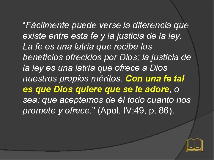 “Fácilmente puede verse la diferencia que existe entre esta fe y la justicia de la ley. La fe es una latría que recibe los beneficios ofrecidos por Dios; la justicia de la ley es una latría que ofrece a Dios nuestros propios méritos. Con una fe tal es que Dios quiere que se le adore, o sea: que aceptemos de él todo cuanto nos promete y ofrece. ” (Apol. IV: 49, p. 86).