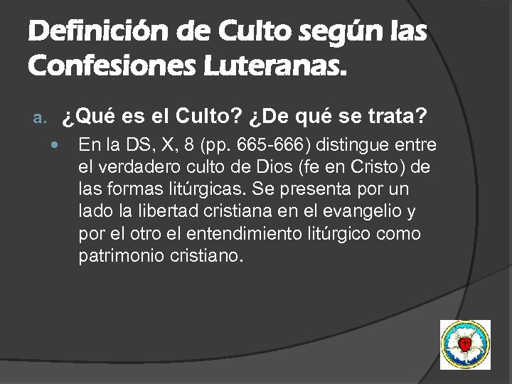 Definición de Culto según las Confesiones Luteranas. ¿Qué es el Culto? ¿De qué se trata? a. En la DS, X, 8 (pp. 665 -666) distingue entre el verdadero culto de Dios (fe en Cristo) de las formas litúrgicas. Se presenta por un lado la libertad cristiana en el evangelio y por el otro el entendimiento litúrgico como patrimonio cristiano.