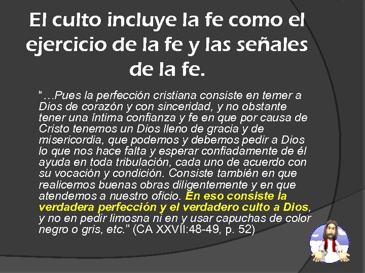 El culto incluye la fe como el ejercicio de la fe y las señales de la fe. “…Pues la perfección cristiana consiste en temer a Dios de corazón y con sinceridad, y no obstante tener una íntima confianza y fe en que por causa de Cristo tenemos un Dios lleno de gracia y de misericordia, que podemos y debemos pedir a Dios lo que nos hace falta y esperar confiadamente de él ayuda en toda tribulación, cada uno de acuerdo con su vocación y condición. Consiste también en que realicemos buenas obras diligentemente y en que atendemos a nuestro oficio. En eso consiste la verdadera perfección y el verdadero culto a Dios, y no en pedir limosna ni en y usar capuchas de color negro o gris, etc. ” (CA XXVII: 48 -49, p. 52)