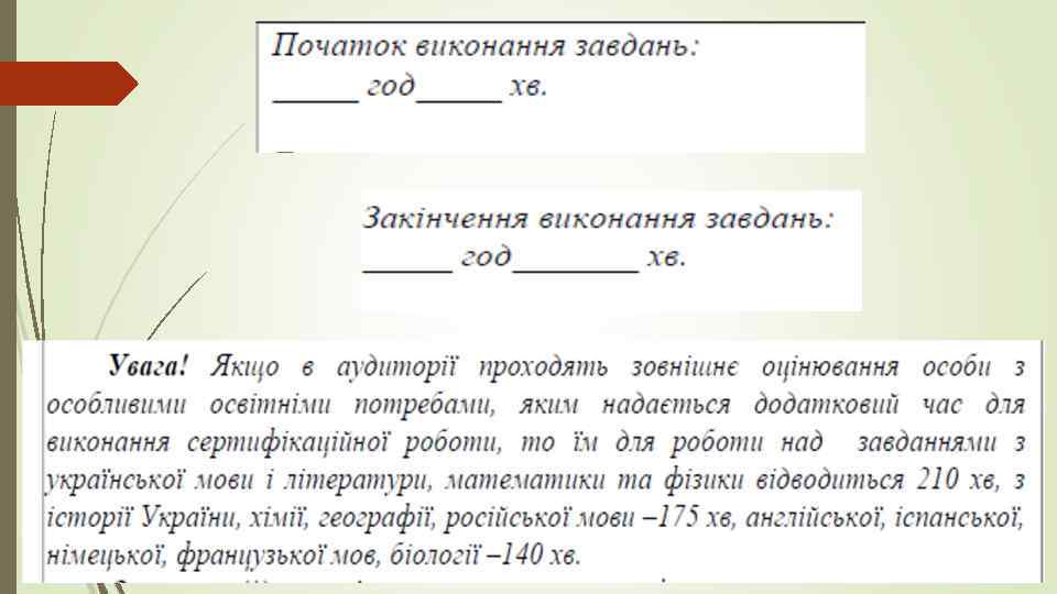За 15 хв до закінчення часу, відведеного на виконання сертифікаційної роботи Повідомити (*) учасникам час, що залишився до закінчення зовнішнього оцінювання. Попередити (*) про необхідність завершення заповнення бланка(ів) відповідей