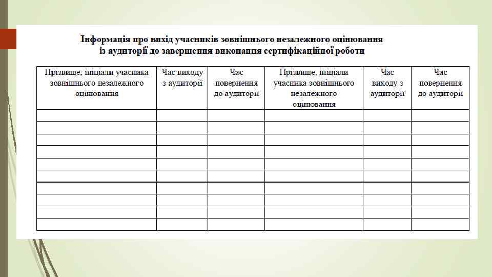 Під час виконання учасниками сертифікаційної роботи Під час зовнішнього оцінювання учасники мають право з дозволу старшого інструктора вийти з аудиторії до закінчення роботи над сертифікаційною роботою. Одночасний вихід кількох учасників з однієї аудиторії до завершення виконання сертифікаційної роботи забороняється. Якщо учаснику потрібно вийти з аудиторії, то він повинен залишити зошит із завданнями сертифікаційної роботи і бланк(и) відповідей на робочому столі, поклавши його(їх) заповненою стороною донизу. Час, який учасник провів за межами аудиторії, не додається йому до часу, відведеного для виконання сертифікаційної роботи.