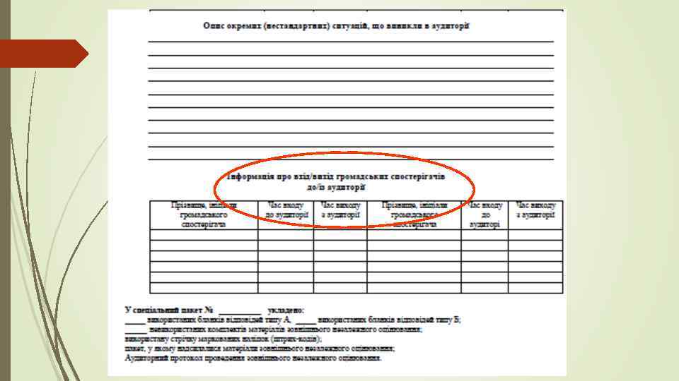 Учасник має засвідчити своїм підписом в Аудиторному протоколі факт передання бланка(ів) відповідей. Після цього він може вийти з аудиторії (інструктор повідомляє про це черговому) або перебувати в ній до моменту отримання зошита із завданнями сертифікаційної роботи, дотримуючись установлених норм поведінки 14. 00