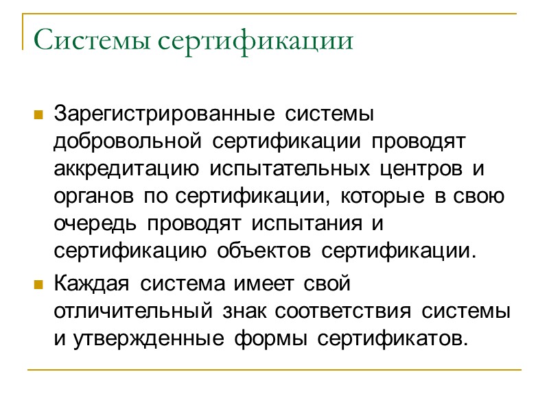 Системы сертификации Зарегистрированные системы добровольной сертификации проводят аккредитацию испытательных центров и органов по сертификации, которые в свою очередь проводят испытания и сертификацию объектов сертификации. Каждая система имеет свой отличительный знак соответствия системы и утвержденные формы сертификатов.