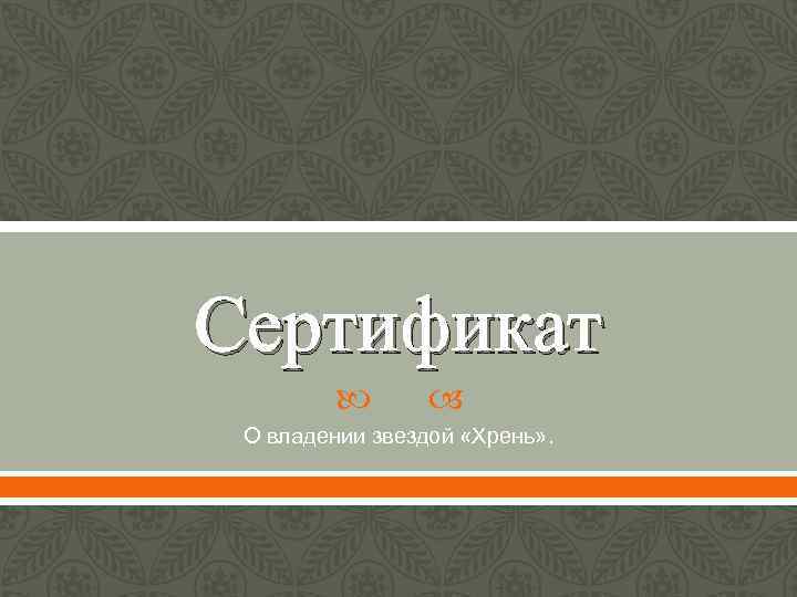 Сертификат вручён Грининой Олесе для предъявления по месту требования. Данный документ свидетельствует о владении и полной свободе распоряжаться, как ей вздумается, звездой(координаты: 45° от лунной орбиты и 1350° от земной орбиты), которая видна в 6: 66 по марсианскому времени.