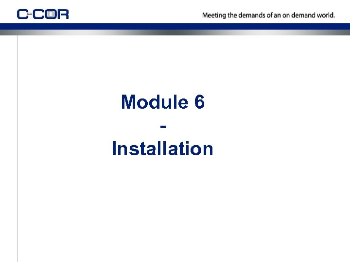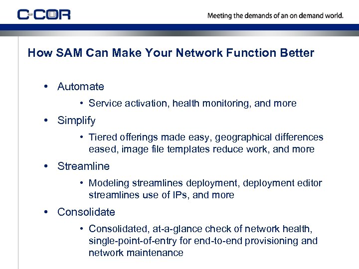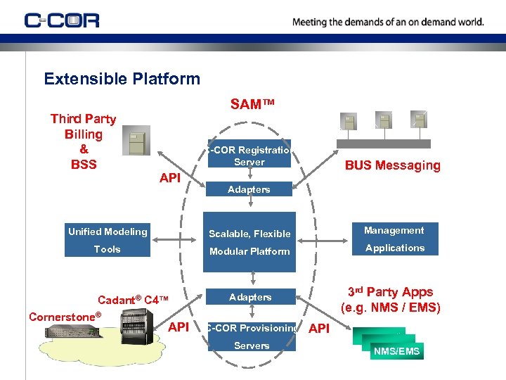 Extensible Platform SAM™ Third Party Billing & BSS C-COR Registration Server API BUS Messaging Adapters Unified Modeling Scalable, Flexible Management Tools Modular Platform Applications Cadant® Cornerstone® C 4™ API 3 rd Party Apps (e. g. NMS / EMS) Adapters C-COR Provisioning Servers API NMS/EMS