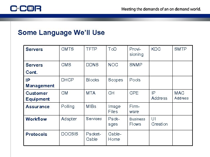 Some Language We’ll Use Servers CMTS TFTP To. D Provisioning Servers CMS DDNS NOC SNMP IP Management DHCP Blocks Scopes Pools Customer Equipment CM MTA CH CPE Assurance Polling MIBs Image Files Firmware Workflow Adapter Services Packages Business KDC SMTP IP Address MAC Cont. Protocols DOCSIS Packet. Cable. Home Flows UI Creation Address