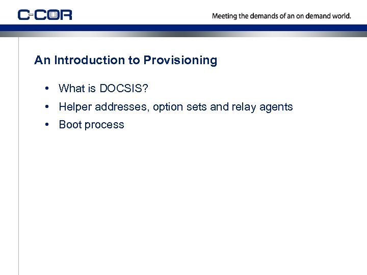 An Introduction to Provisioning • What is DOCSIS? • Helper addresses, option sets and relay agents • Boot process