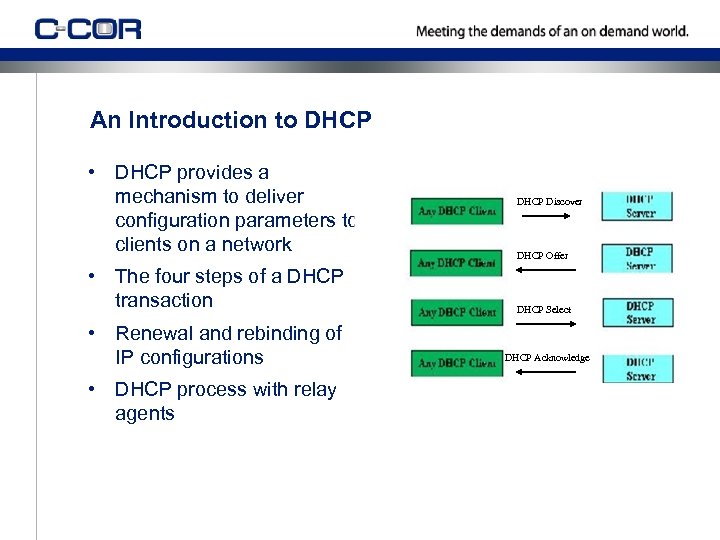 An Introduction to DHCP • DHCP provides a mechanism to deliver configuration parameters to clients on a network • The four steps of a DHCP transaction • Renewal and rebinding of IP configurations • DHCP process with relay agents DHCP Discover DHCP Offer DHCP Select DHCP Acknowledge