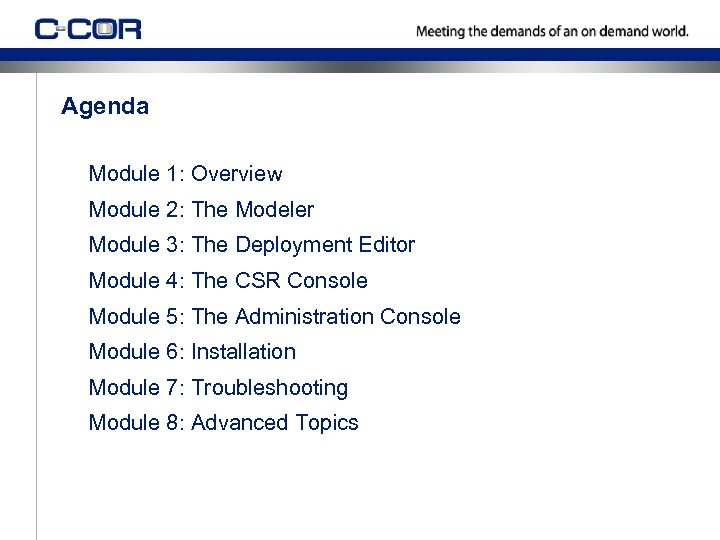 Agenda Module 1: Overview Module 2: The Modeler Module 3: The Deployment Editor Module 4: The CSR Console Module 5: The Administration Console Module 6: Installation Module 7: Troubleshooting Module 8: Advanced Topics