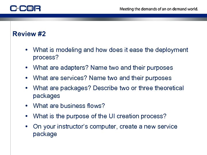 Review #2 • What is modeling and how does it ease the deployment process? • What are adapters? Name two and their purposes • What are services? Name two and their purposes • What are packages? Describe two or three theoretical packages • What are business flows? • What is the purpose of the UI creation process? • On your instructor’s computer, create a new service package