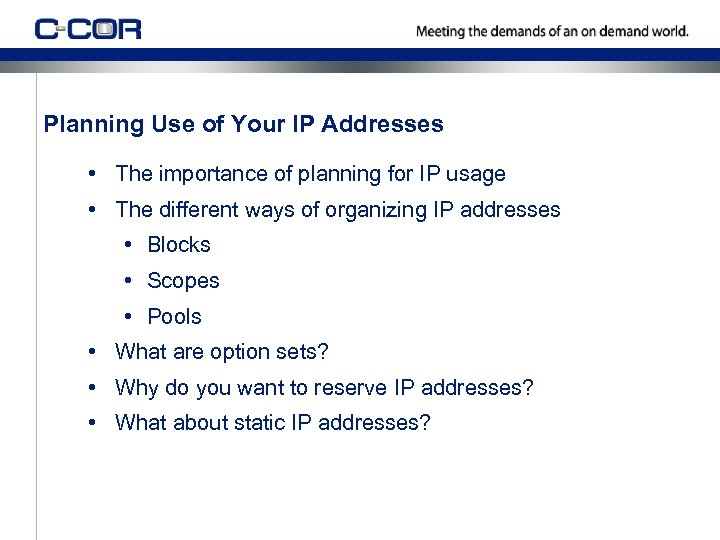 Planning Use of Your IP Addresses • The importance of planning for IP usage • The different ways of organizing IP addresses • Blocks • Scopes • Pools • What are option sets? • Why do you want to reserve IP addresses? • What about static IP addresses?