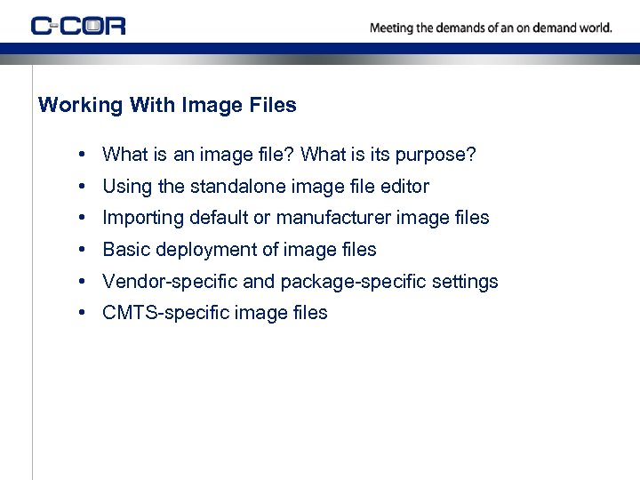 Working With Image Files • What is an image file? What is its purpose? • Using the standalone image file editor • Importing default or manufacturer image files • Basic deployment of image files • Vendor-specific and package-specific settings • CMTS-specific image files