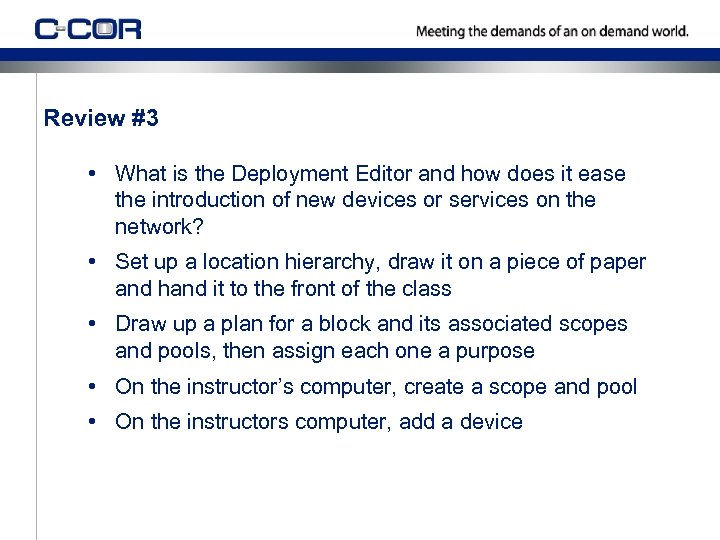 Review #3 • What is the Deployment Editor and how does it ease the introduction of new devices or services on the network? • Set up a location hierarchy, draw it on a piece of paper and hand it to the front of the class • Draw up a plan for a block and its associated scopes and pools, then assign each one a purpose • On the instructor’s computer, create a scope and pool • On the instructors computer, add a device