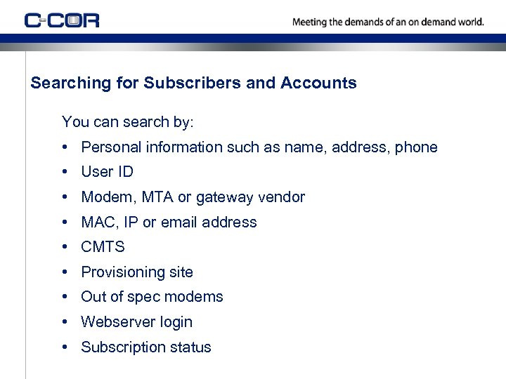 Searching for Subscribers and Accounts You can search by: • Personal information such as name, address, phone • User ID • Modem, MTA or gateway vendor • MAC, IP or email address • CMTS • Provisioning site • Out of spec modems • Webserver login • Subscription status
