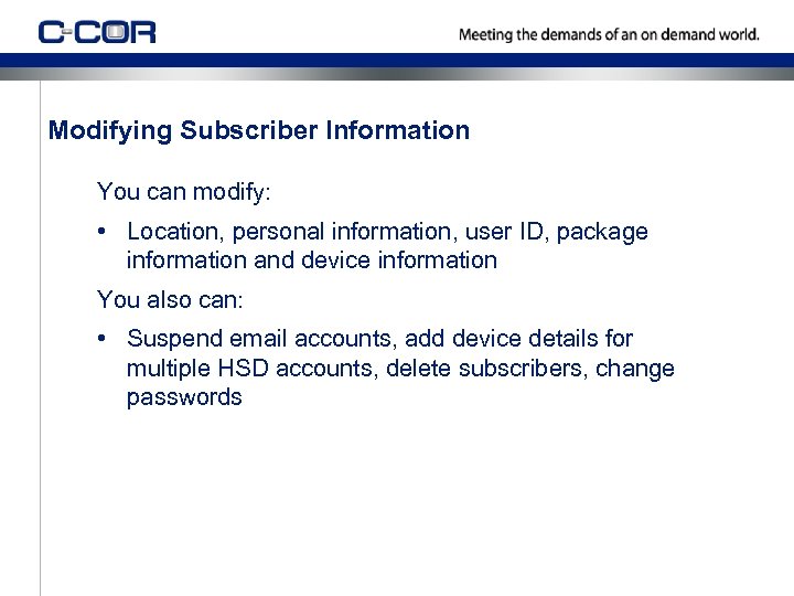 Modifying Subscriber Information You can modify: • Location, personal information, user ID, package information and device information You also can: • Suspend email accounts, add device details for multiple HSD accounts, delete subscribers, change passwords