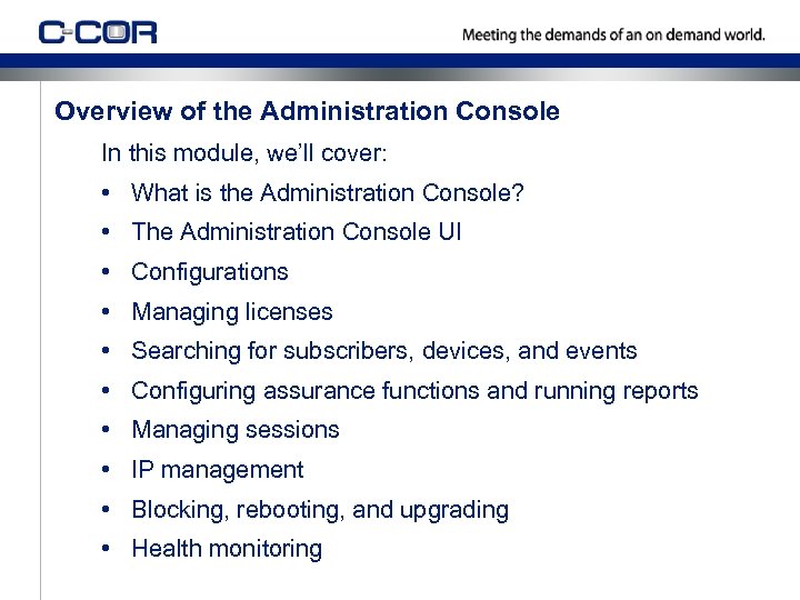Overview of the Administration Console In this module, we’ll cover: • What is the Administration Console? • The Administration Console UI • Configurations • Managing licenses • Searching for subscribers, devices, and events • Configuring assurance functions and running reports • Managing sessions • IP management • Blocking, rebooting, and upgrading • Health monitoring