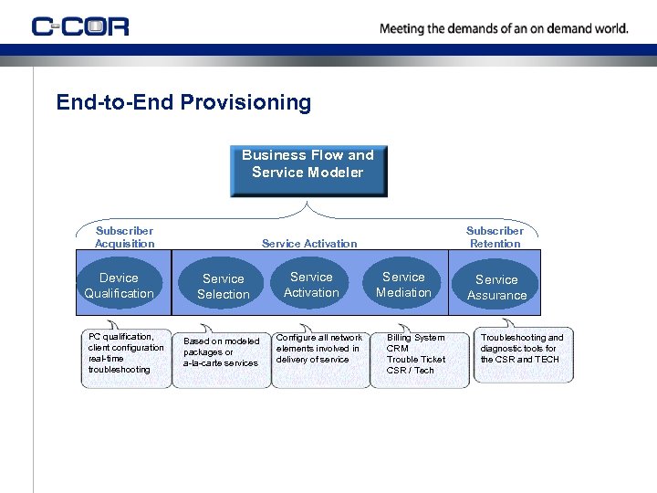C- P C-C COro OR Rduc Mots de ler A Vertically Integrated Solution Business Layer Billing and Customer Care Systems Workflow Rules and Policies Service Layer Network Layer Element Layer Network Elements IP based Provisioning Framework Provisioning Systems, Element and NMS Devices – CMTS, CM, Servers, etc C-COR models both business processes and service / network elements to give a fully-integrated, vertical solution for transparent service deployment over any network