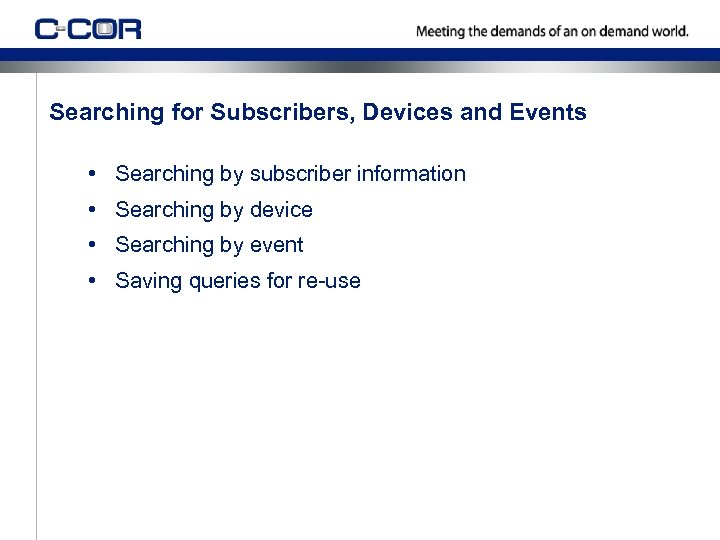 Searching for Subscribers, Devices and Events • Searching by subscriber information • Searching by device • Searching by event • Saving queries for re-use