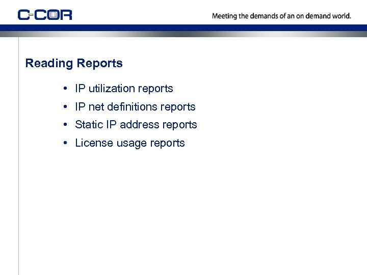 Reading Reports • IP utilization reports • IP net definitions reports • Static IP address reports • License usage reports