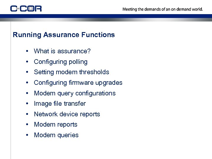 Running Assurance Functions • What is assurance? • Configuring polling • Setting modem thresholds • Configuring firmware upgrades • Modem query configurations • Image file transfer • Network device reports • Modem queries