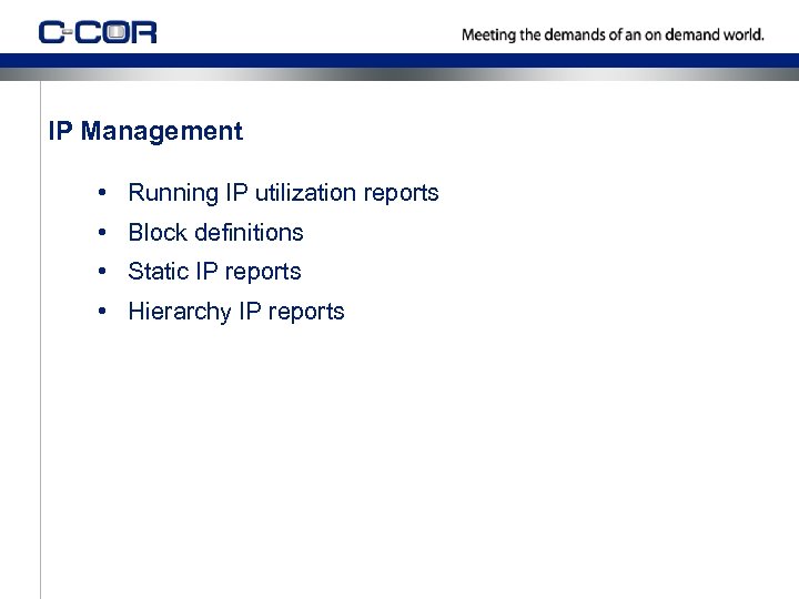 IP Management • Running IP utilization reports • Block definitions • Static IP reports • Hierarchy IP reports