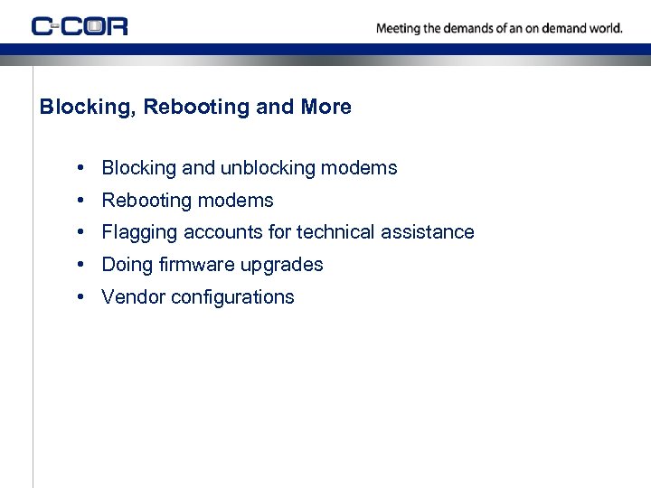 Blocking, Rebooting and More • Blocking and unblocking modems • Rebooting modems • Flagging accounts for technical assistance • Doing firmware upgrades • Vendor configurations