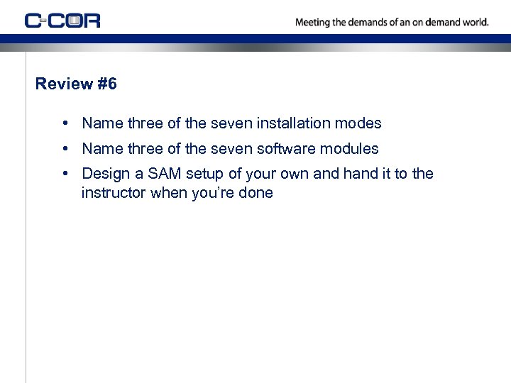 Review #6 • Name three of the seven installation modes • Name three of the seven software modules • Design a SAM setup of your own and hand it to the instructor when you’re done